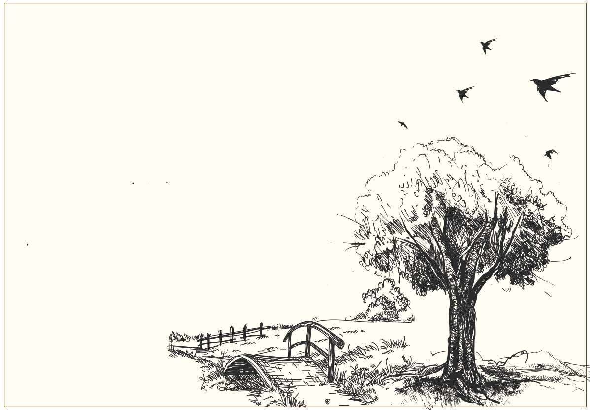 • carte remerciements décès arbuste chêne esquisse noire et blanc et traversée d'un pont en bois