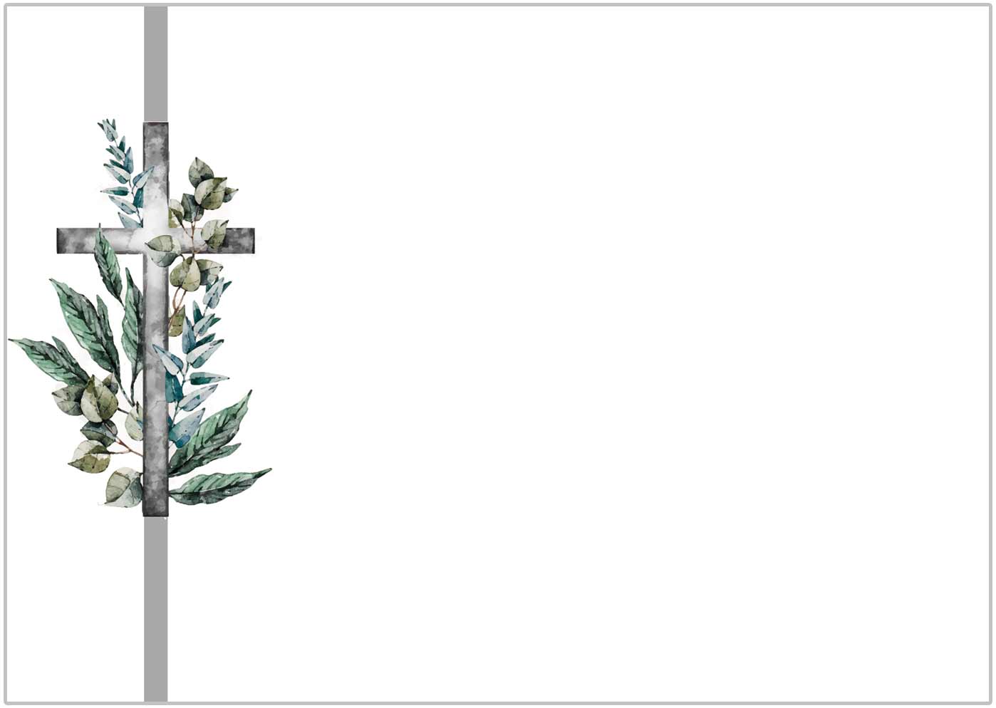 Carte remerciements de décès, tradition Croix catholique sublime de feuillages verts