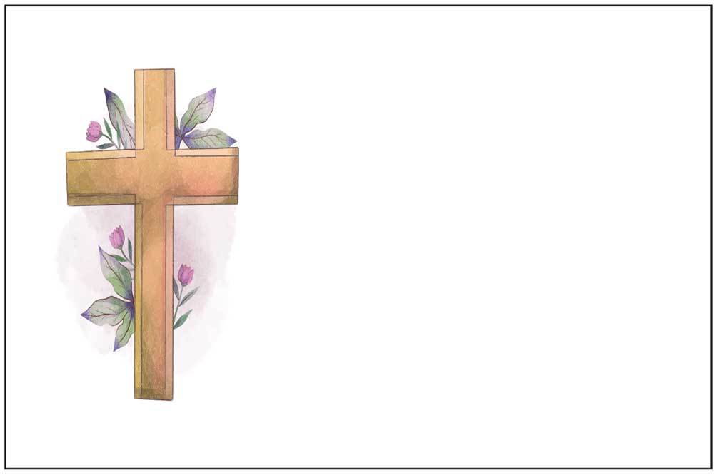 Carte remerciements décès croix en bois, illustrée de la croix de religion en bois entourée de fleurs violettes